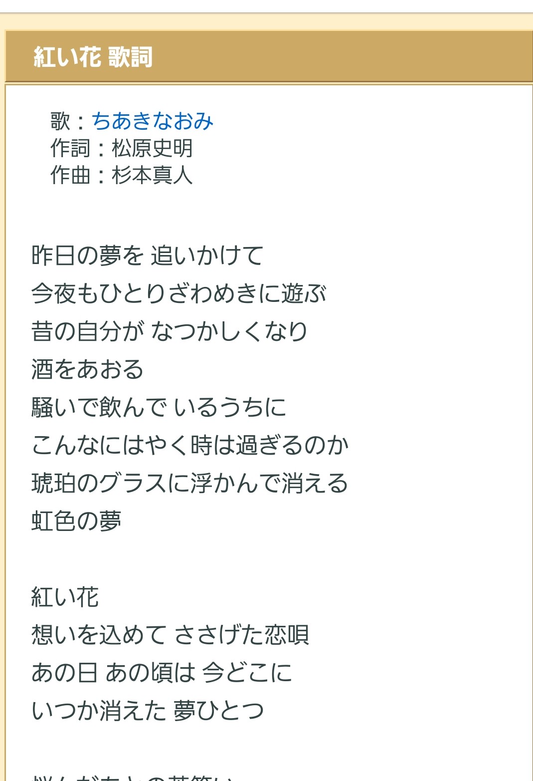 紅い花歌詞 昨日の夢を 追いかけて 今夜もひとり ざわめきに遊ぶ 昔の自分が なつかしくなり 酒をあおる 騒いで飲んで いるうちに こんなにはや 今すぐkkboxを使って好きなだけ聞きましょう。 歌手:すぎもとまさと作詞:松原史明作曲:杉本眞人昨日の夢を 追いかけて今夜もひとり ざわめきに遊ぶ昔の自分が なつかしくなり酒をあおる